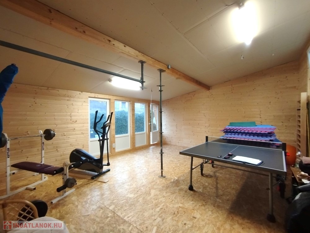 Garázs melletti terem: 34.5 nm. OSB lap padlózat, oldalfala fenyő lambériával burkolt, klímával ellátott.A ház lakói edzőteremnek alakították ki, de mérete, elhelyezkedése, világossága miatt csak a képzelet szab határt a későbbi funkcióit illetően.