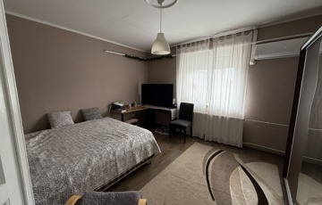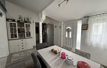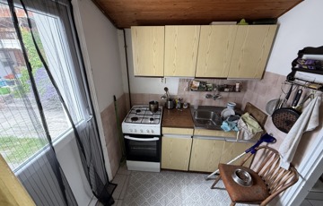 A kisebb, 40 m²-es ház külön bejárattal rendelkezik, saját fürdőszobával, konyhával és egy szobával. Fűtése parapetes gázkazánról történik, klíma és villanybojler szintén rendelkezésre áll.