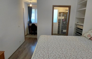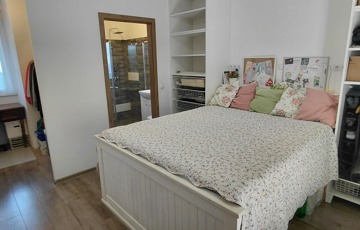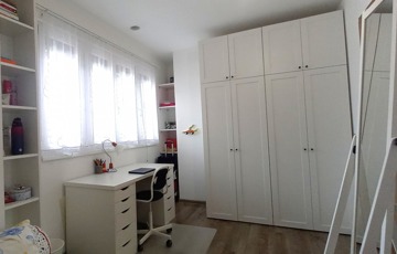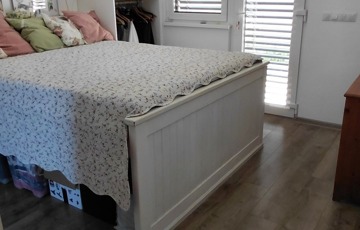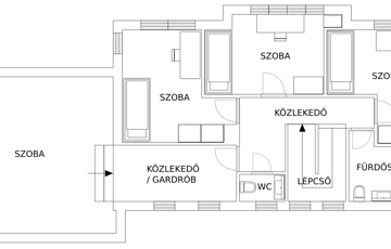 -az emeleten (77nm): három hálószoba egy fürdő-WC (itt még burkolás szükséges) és egy külön Wc került kialakításra. Ezen kívül egy gardróbon keresztül egy 26 nm-es vendégszoba található, mely külön lakrészként is használható.