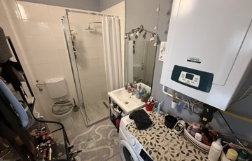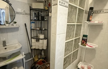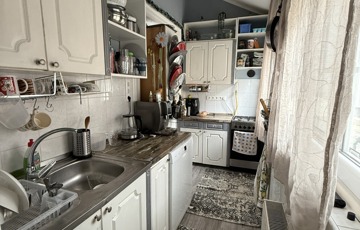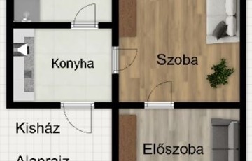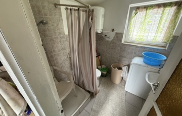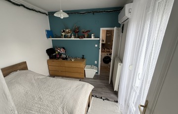 A kisebb, 40 m²-es ház külön bejárattal rendelkezik, saját fürdőszobával, konyhával és egy szobával. Fűtése parapetes gázkazánról történik, klíma és villanybojler szintén rendelkezésre áll.