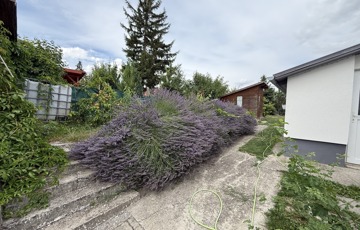 A gondosan karbantartott kertben gyümölcsfák – többek között alma, meggy, sárgabarack és őszibarack – biztosítják a friss termést, míg a veteményes és magaságyás a saját termesztés örömét kínálja.