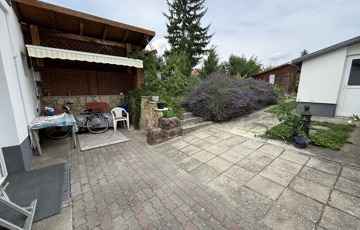 Az udvar minden szempontból jól átgondolt: térkövezett, rendezett, akár autó számára is biztosít parkolást. Egy 25 m²-es, fedett kiülő teremt kellemes, árnyékos pihenőhelyet, emellett fa tároló gondoskodik a kerti szerszámok és kerékpárok elhelyezéséről, valamint a ház alatt egy 12 m2-es pince is megtalálható.