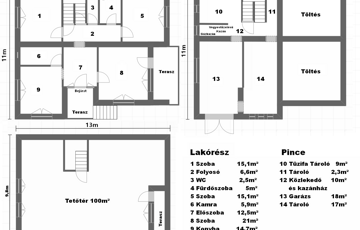 A földszinten garázs, műhely, kazánház, tüzelőtároló és több tárolóhelyiség kapott helyet, a garázsból pedig belső lépcső vezet közvetlenül a lakótérbe. Parkolás megoldott garázsban és az udvaron is.